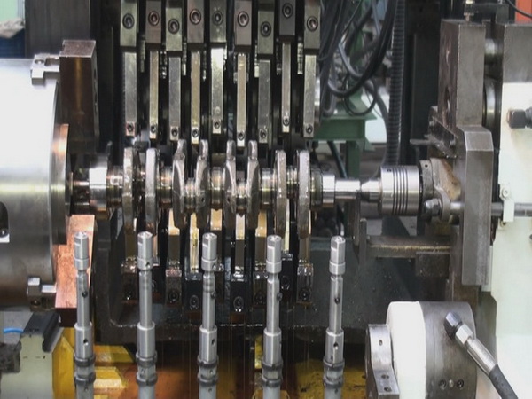 3.滾壓四缸機曲軸:滑臺橫向進給,九個夾鉗油缸通過滾壓頭分別夾緊工件上各自對應(yīng)的主軸頸和連桿頸,此時潤滑油開。滾壓時九個夾鉗油缸按預定壓力進行加卸載,按設(shè)定滾壓圈數(shù)完成滾壓。滾壓完成后滾壓裝置退出。
